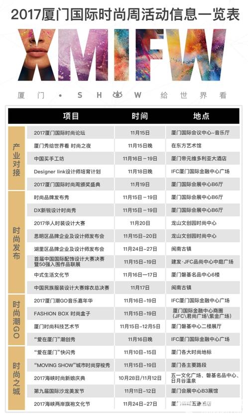 此外,中式文化生活节、厦门时尚科技艺术节、2017海峡两岸旗袍文化节等活动也各具亮点。