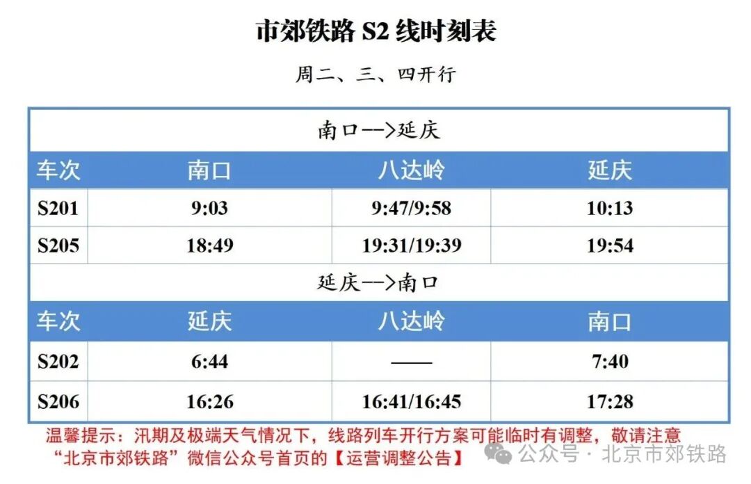 北京S2线2025年最新时刻表(2025年10月25日起更新)