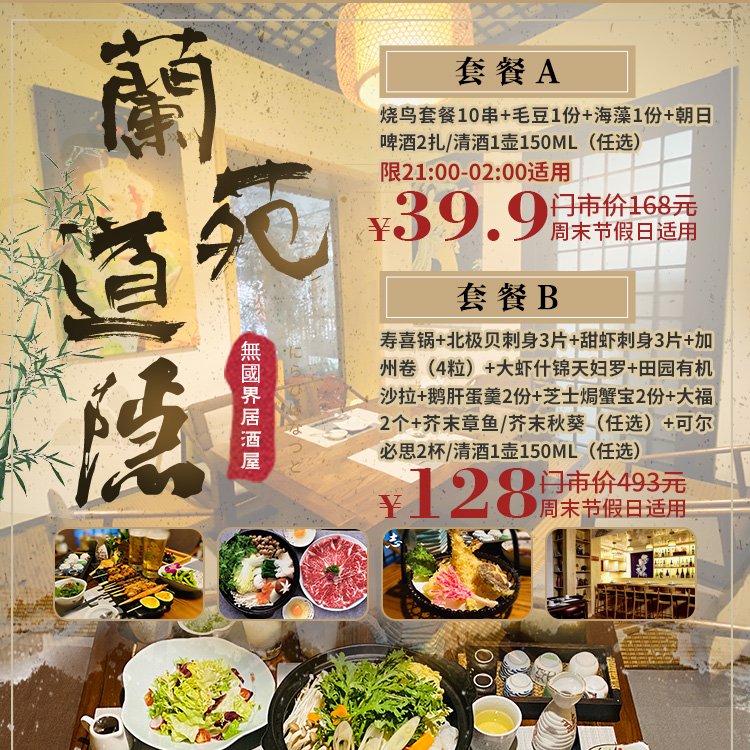 团购朝阳区三里屯新东路首12号院首开铂郡南区4号楼B1-032蘭苑道隐無國界居酒屋超值套餐、蘭苑道隐無國界居酒屋双人餐、蘭苑道隐無國界居酒屋优惠券、蘭苑道隐無國界居酒屋代金券、蘭苑道隐無國界居酒屋折扣券就上墙根网!