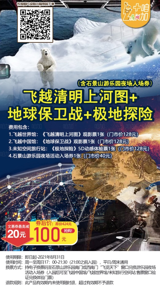 【石景山游乐园】文惠券后100元享飞越清明上河图+地球保卫战+极地探险(含石景山游乐园夜场活动入场券)(墙根网微信公众号回复【文惠券】领券立减++)