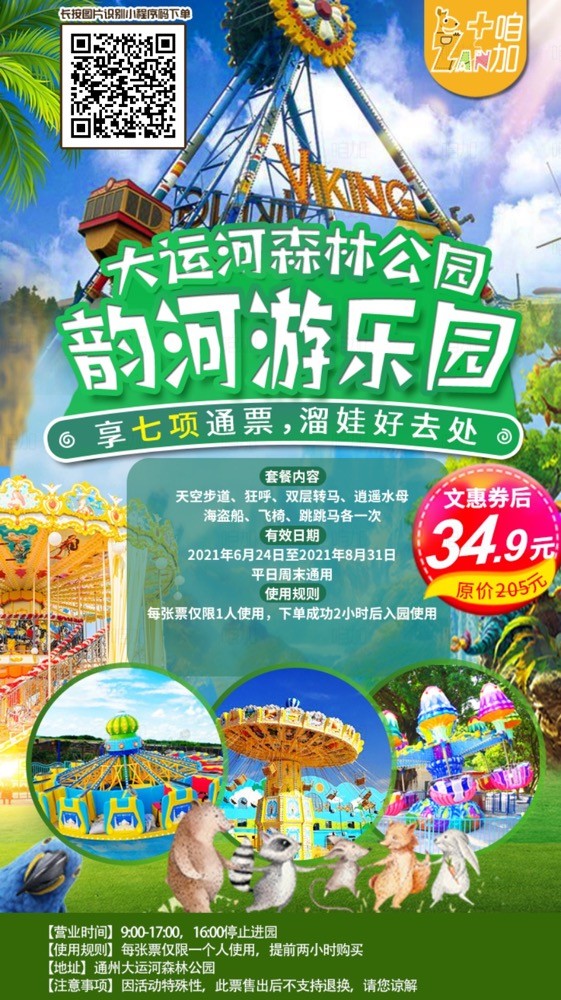 【通州区】藏在通州の户外游乐场!文惠券后34.9元抢大运河森林公园韵河游乐园,七大项目畅玩一次:旋转木马、海盗船、惊呼狂叫、摇头飞椅...下单2小时候使用(墙根网公众号回复【文惠券】领券立减,吉象年票2021年12月31日前免票一次)